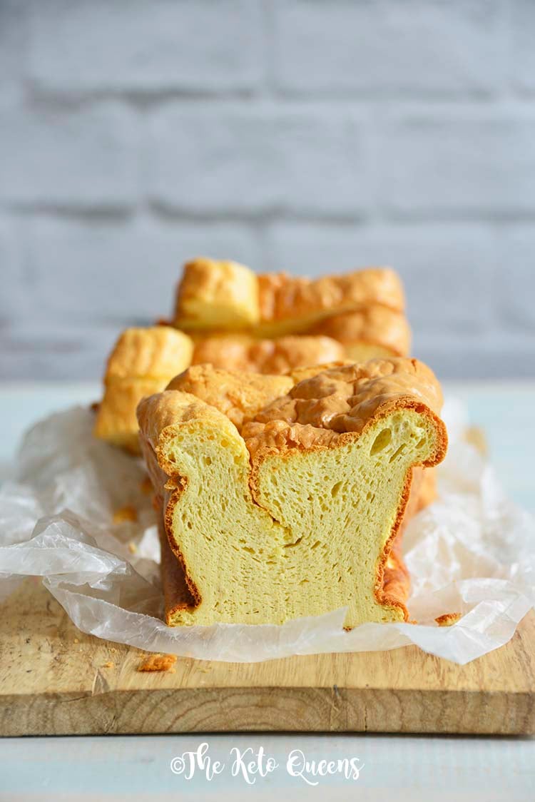 Compare the ingredients for regular white bread with the ingredients in our keto homemade white bread. Our loaf uses eggs, cream cheese, and unflavored whey protein powder as the base for a soft, fluffy texture. And bonus, make it at home and you won’t have all the additives and preservatives!