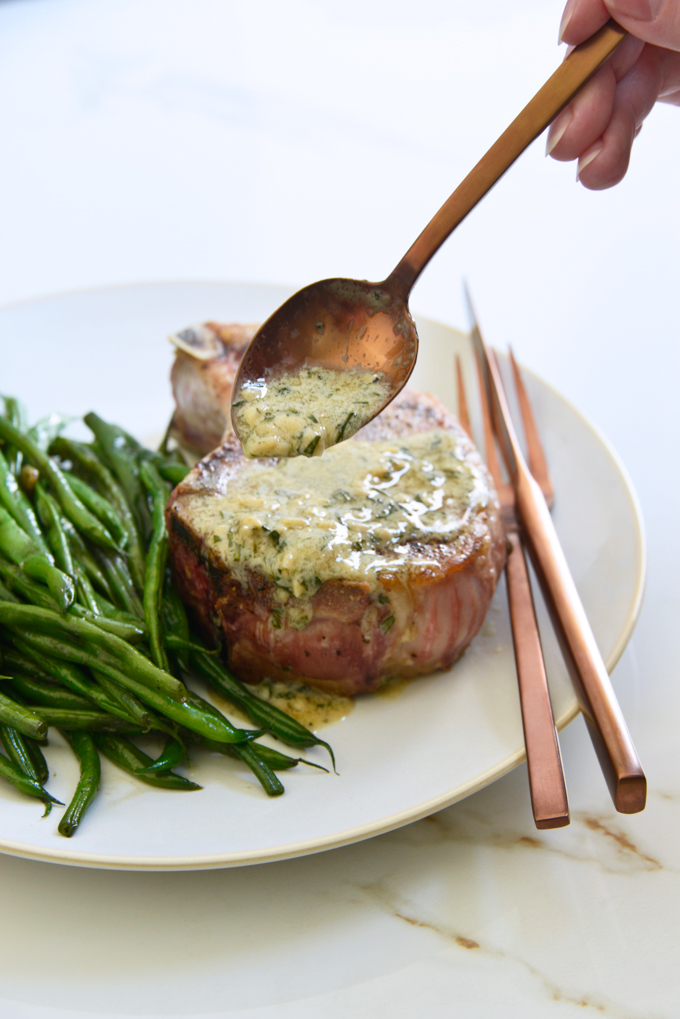 We served these with a side of roasted green beans and it made for an amazing dinner! If green beans aren’t your thing, you can most certainly cook up another side of your choice to pair with this cast iron pork chop recipe. I love switching it up and playing around with different side options so it feels like a new dish every time I make it for dinner.