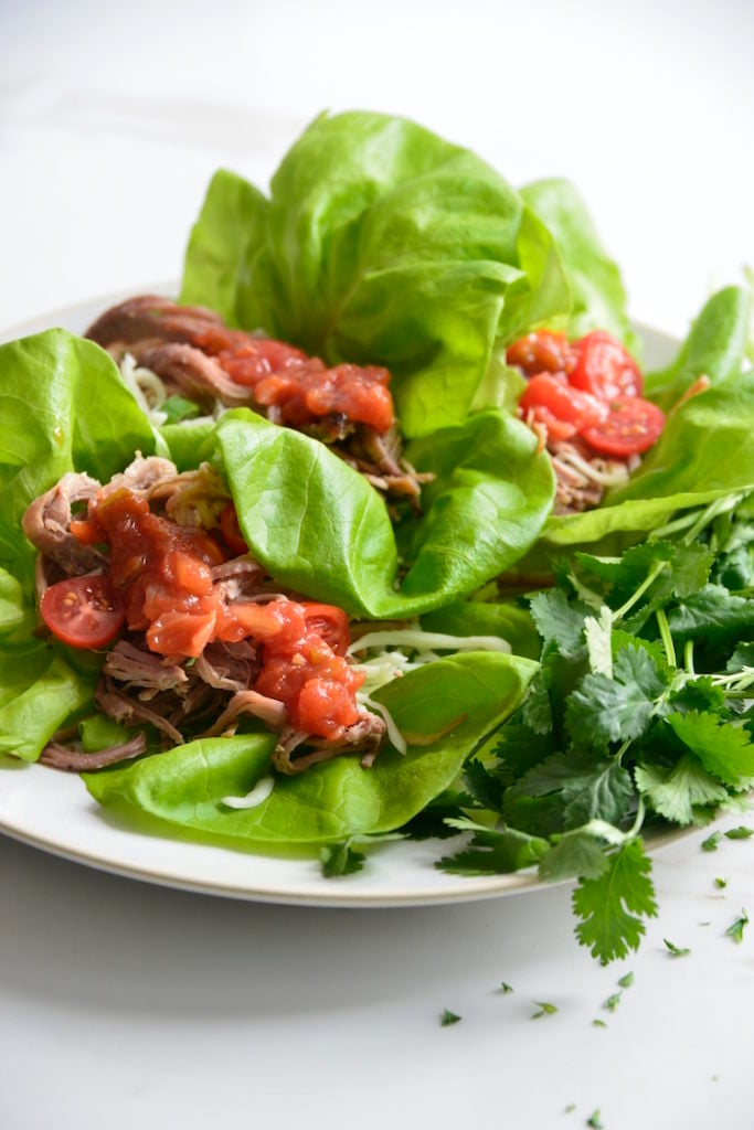 Lettuce wrapped tacos are a great way to eat tacos if you’re trying to cut out carbs. Today we’re using leftover pulled pork from our slow cooker pork butt recipe to make these tacos quick and easy!