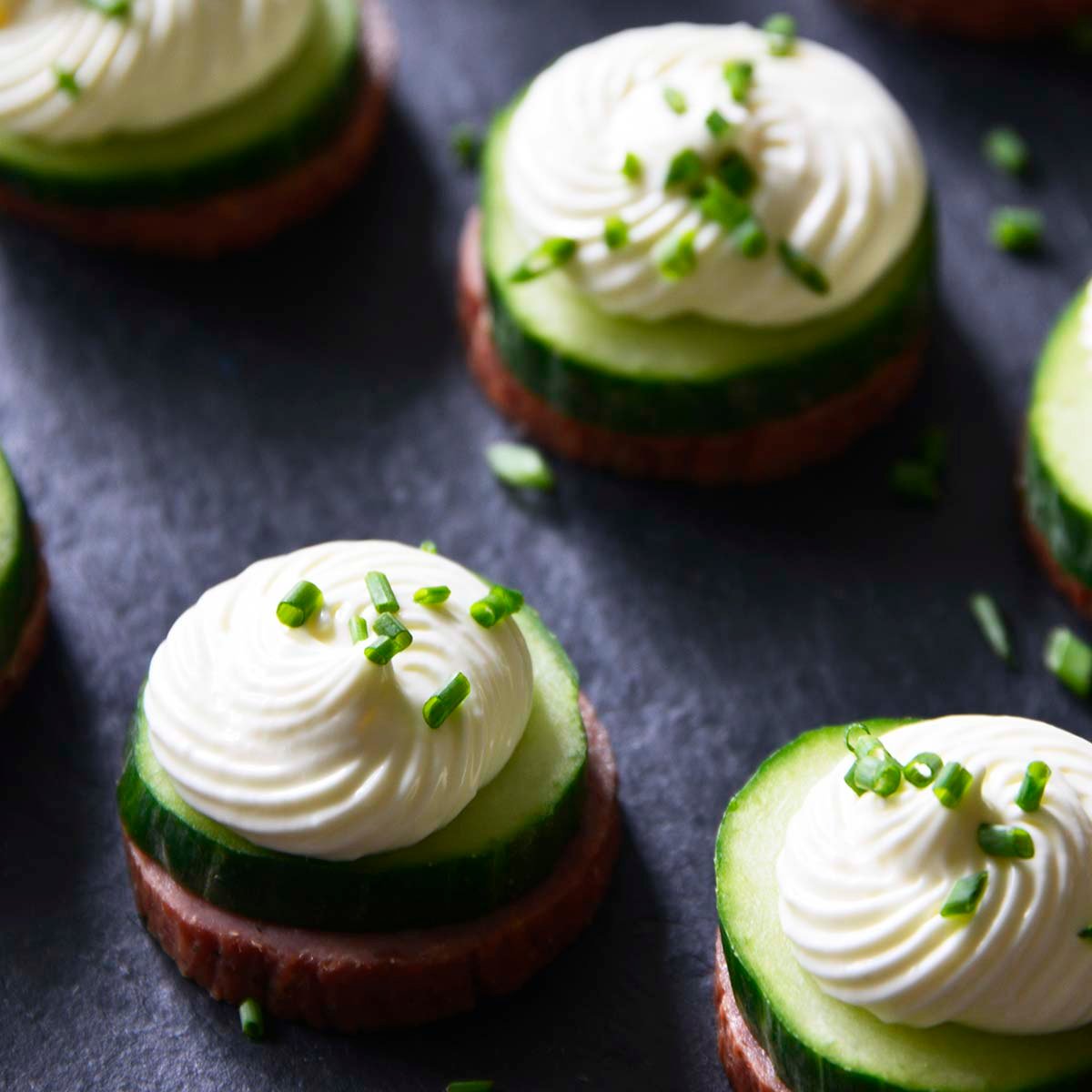 - To assemble the bites, top each slice of sausage with a slice of cucumber. Pipe the cream cheese mousse on top, and sprinkle on the chives.