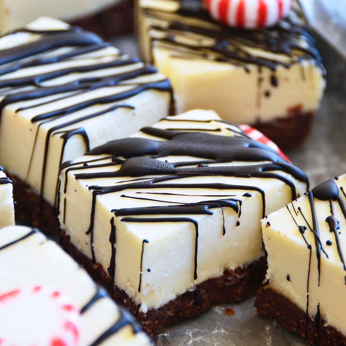 - Cut the cheesecake into 8 bars and drizzle the melted chocolate on top. Garnish with peppermint candies, if desired.