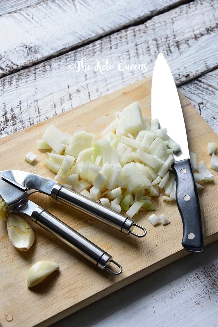 Measure out all the ingredients. Chop the onion and garlic.