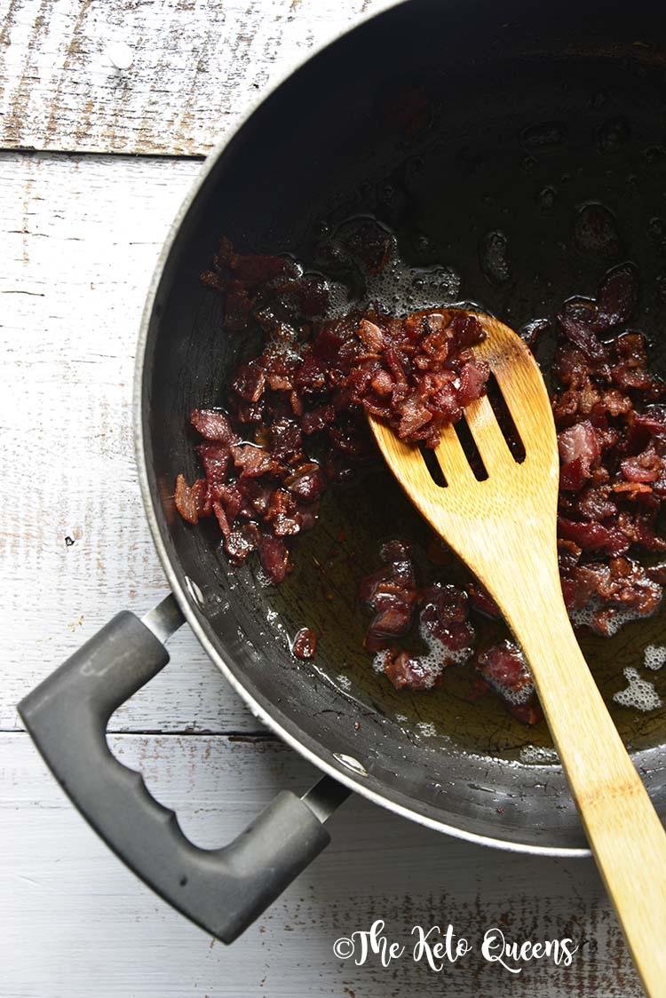 - Heat a 5-quart soup pot over high heat. Once hot, add the bacon and cook until crispy, about 5 to 7 minutes, stirring occasionally. Use a slotted spoon to transfer half the bacon to a bowl and set aside for garnish.
