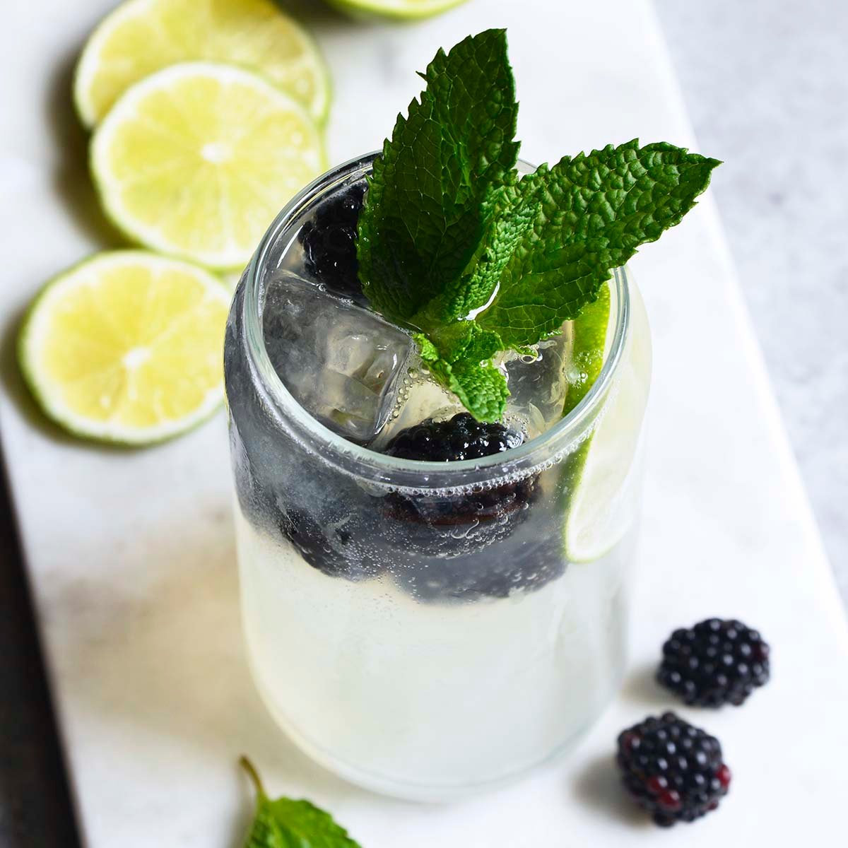 First, add the lime juice, stevia, and sparkling water to a glass and gently stir. Then add the mint sprig, blackberries, and ice. Serve immediately.