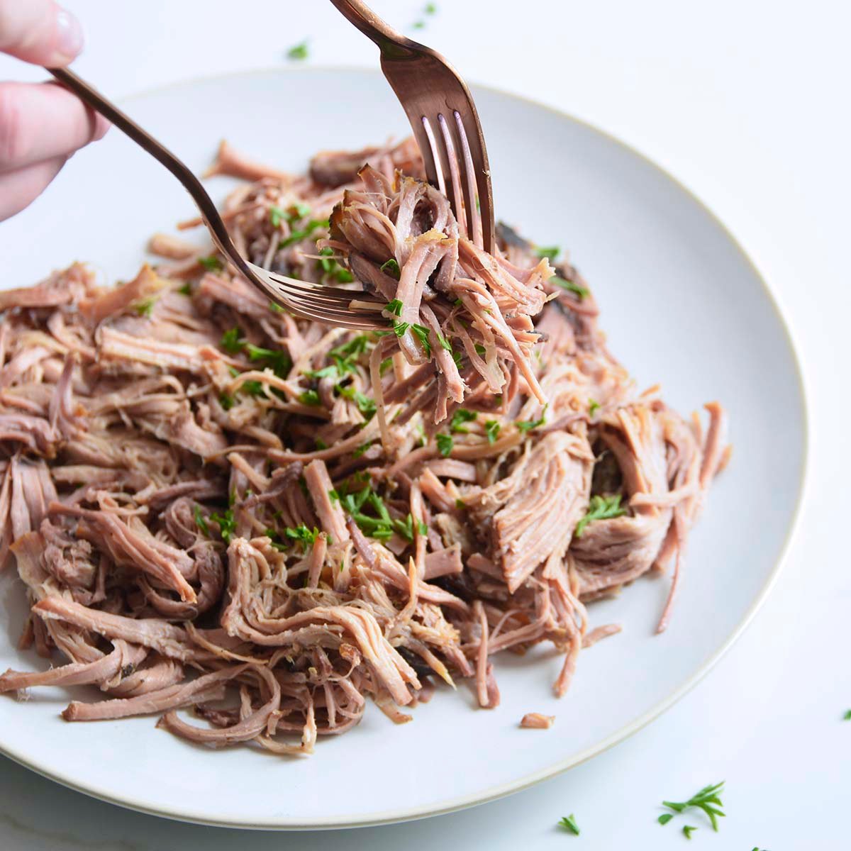 - Use 2 forks to shred the pork, and serve with 2 tablespoons of the liquid on top to keep the meat moist.