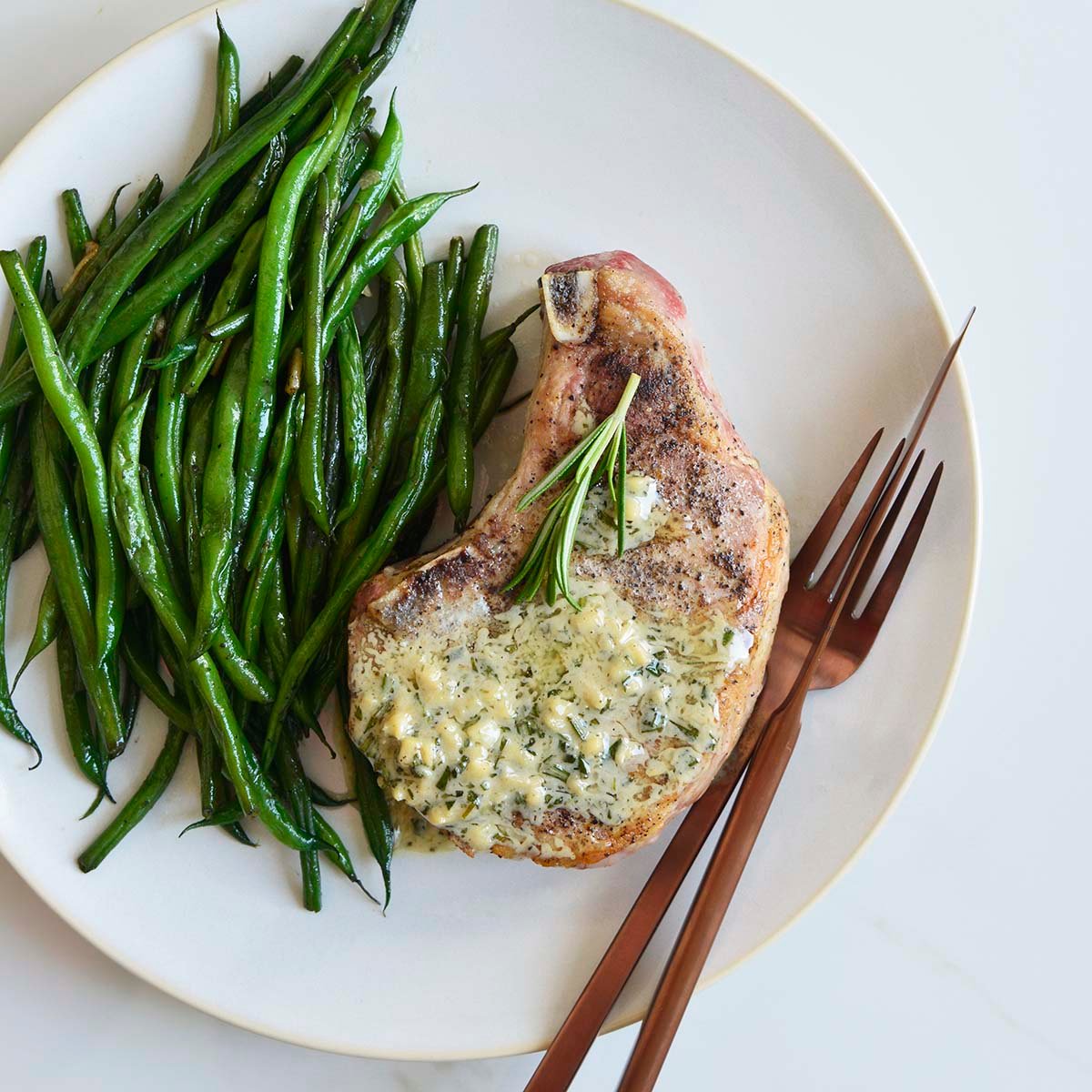 We served these with a side of roasted green beans and it made for an amazing dinner! If green beans aren’t your thing, you can most certainly cook up another side of your choice to pair with this cast iron pork chop recipe. I love switching it up and playing around with different side options so it feels like a new dish every time I make it for dinner.