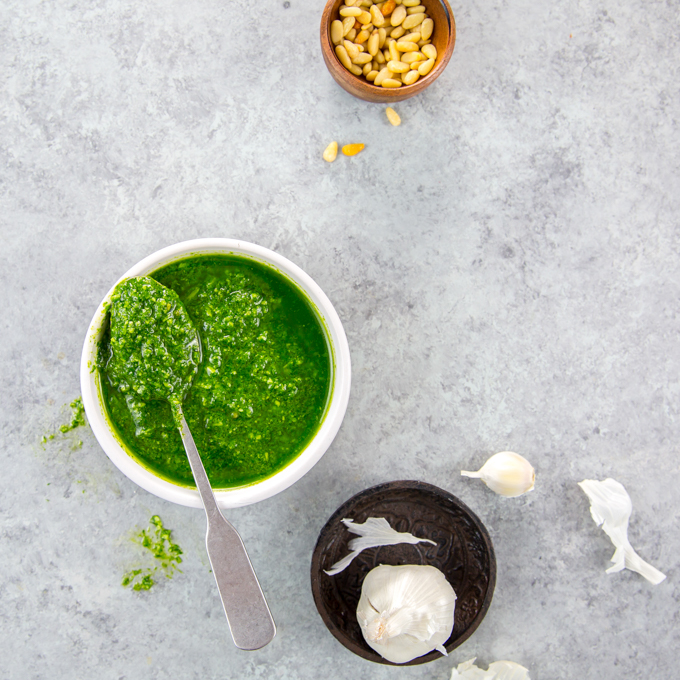 On a non-traditional note – we also love to use this homemade pesto sauce as a dip! We sometimes whip up a batch of homemade parmesan cheese crisps and dip them in the pesto sauce!
