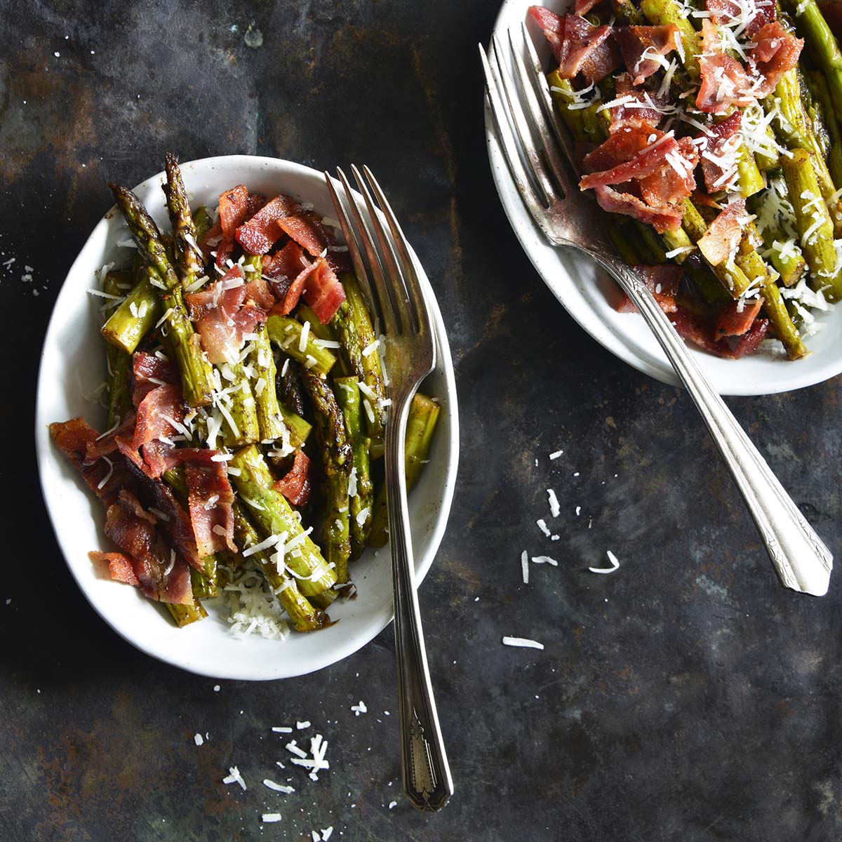 Here asparagus is braised in chicken stock and balsamic vinegar with a hint of sweetness. Bacon adds salt and texture and Parmesan adds cheesy nuttiness. This recipe really elevates asparagus, which is already a very elegant vegetable, into something truly special.
